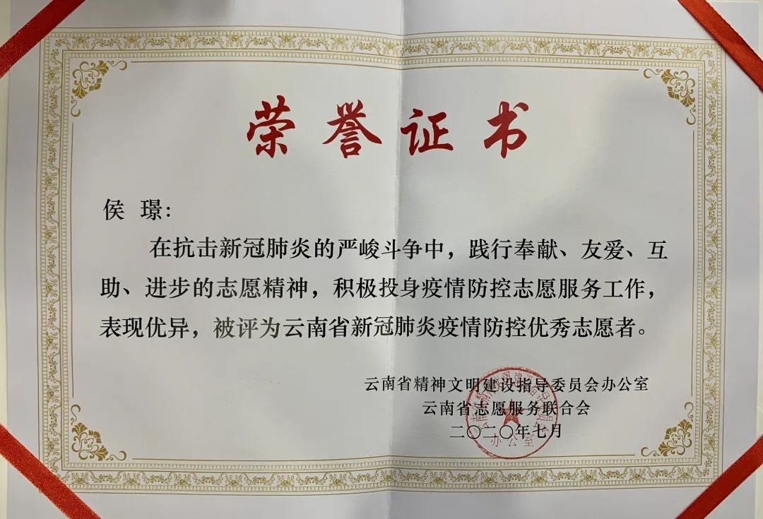 尽管侯璟已经有丰富的志愿服务经历,但这次边境防疫翻译志愿服务比以往任何志愿服务动都要艰巨。在边境防疫服务中她克服了三大困难。一是天气酷热,蚊虫侵扰,在每天体感温度33摄氏度以上的高温下工作,少不了穿防护服和口罩带来的大汗淋漓,不到两个小时手套全是汗水,想上厕所的时候也只能憋着,一干就是七八个小时。二是不少中老、中缅边境人员受教育程度较低,沟通困难,大多只会讲当地的少数民族语言,这让她的翻译工作更加困难,需要准确的摘取关键信息进行翻译,以准确了解他们的移动轨迹、回乡地址和身体状况。三是在边境地区还有偷渡、传染病等风险存在,有时候只能不断地喷酒精来寻求心理安慰。但是面对这些困难她没有退缩,始终如一做好志愿服务工作。优异的表现让她在评选极其严格的优秀志愿者评比中脱颖而出,荣获“云南省新冠肺炎疫情防控优秀志愿者”。在评选出来的42名全省优秀志愿者中,有且仅有三名大学生,而侯璟成了获此殊荣的大学生之一。她愈发能够感受到对祖国的热爱,更加为自己是一个中国人而骄傲,是一个共产党员而自豪!