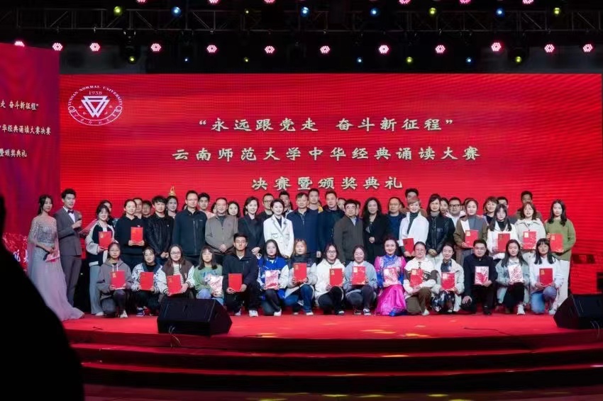 为贯彻落实党的二十大精神,深入开展社会主义核心价值观宣传教育,全面落实教育部《关于切实加强新时代高等学校美育工作的意见》,11月17日晚,由党委宣传部、教务处、公共艺术教育中心、校团委等部门主办,传媒学院、音乐舞蹈学院等承办的“永远跟党走 奋斗新征程”中华经典诵读大赛在我校呈贡校区东区贝壳广场举行。校党委副书记李宏、副校长武友德、党委宣传部部长余冰释、教务处处长陈新、学生处处长张国华、研究生处处长黄海涛、公共艺术教育中心副主任何纾、校团委副书记赵彪、音舞学院书记和红军、副书记杨劲勐、传媒学院副院长肖青莅临比赛现场观赛和指导。本次决赛暨颁奖典礼由传媒学院谭辉老师担任总导演,由云南广播电视台主持人王益洲、李丹、樊亦涵、刘永京和马莎担任评委。
