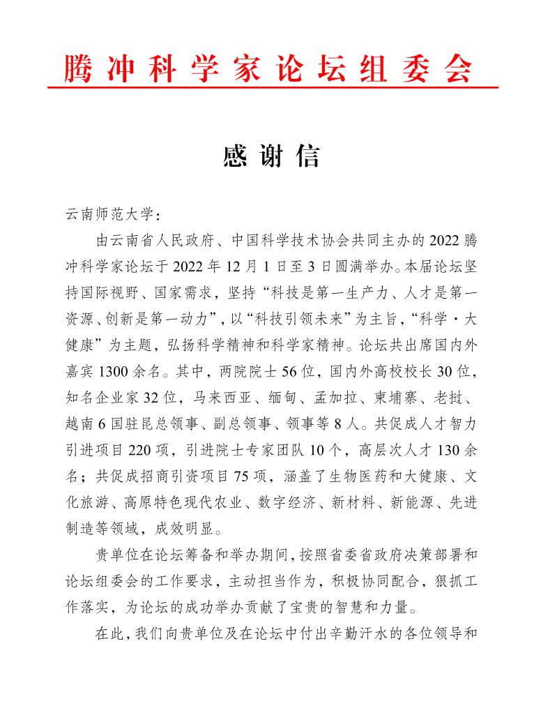 近日,学校收到腾冲科学家论坛组委会发来的感谢信。信中指出,在论坛筹备和举办期间,365英国上市官网按照省委省政府决策部署和论坛组委会的工作要求,主动担当作为,狠抓工作落实,为大会的成功举办贡献了宝贵的智慧和力量。