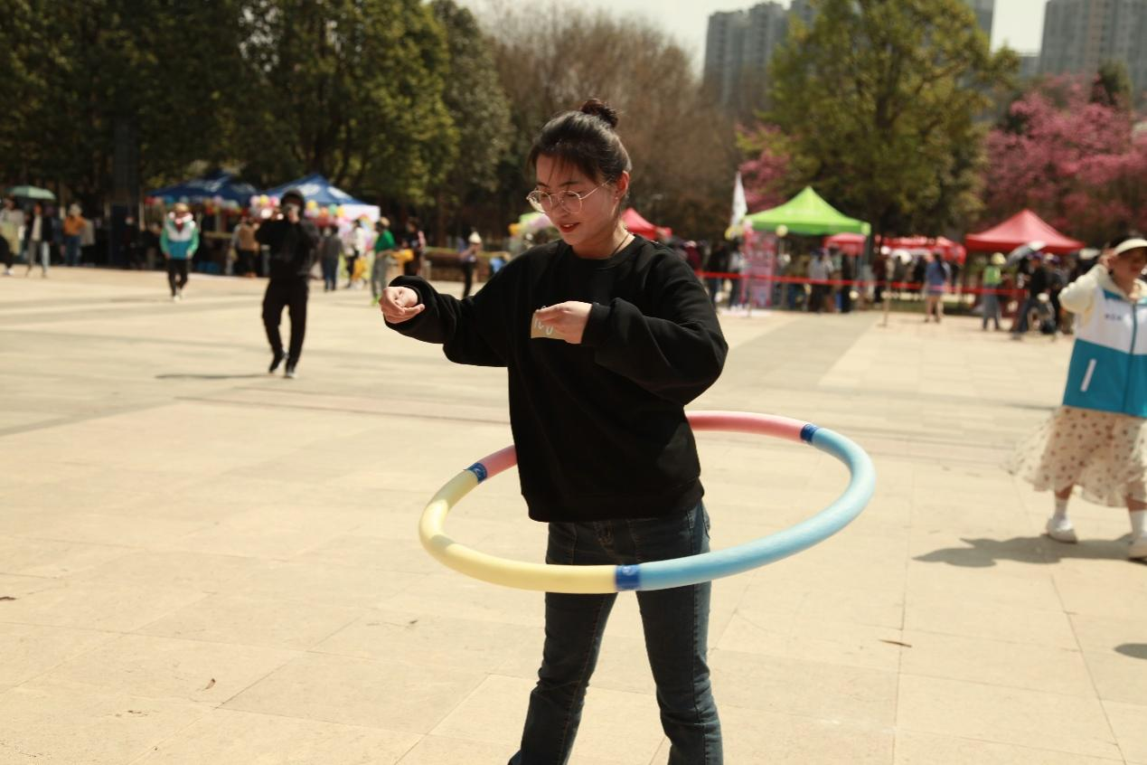“太厉害了!踢毽子第一!”“快接住,往上抛!”……一阵阵欢呼声不断从“最佳拍档”“拥抱毽康”“五谷丰登”等活动场地传出。参赛选手们一边积极地参与活动、努力地寻找游戏技巧,一边互相传授着自己的比赛心得。围观师生也不停地为参赛人员们呐喊助威。