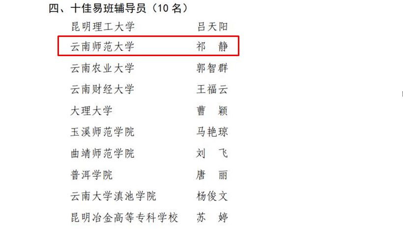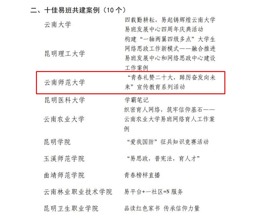 近日,中共云南省委教育工委、云南省高校易班发展中心组织开展了云南省2022年度高校易班工作优秀成果遴选和展示活动。我校在此次评选中斩获佳绩,获得了“十佳易班共建高校”、“十佳易班共建案例”、“十佳易班指导教师”、“十佳易班辅导员”及“十佳易班工作站站长”五项荣誉,涵盖了所有奖项。