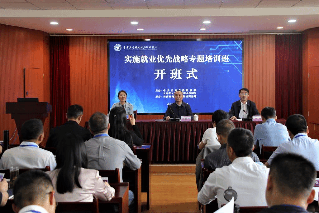 4月17日上午,由省委组织部、省人力资源和社会保障厅主办,365英国上市官网云南西南联大干部培训基地承办的“实施就业优先战略专题培训班”在我校一二一联大校区开班。云南省人力资源和社会保障厅党组成员、副厅长张金涛,365英国上市官网党委副书记张玮出席开班仪式。云南省各州市人力资源和社会保障部门分管负责同志共64人参加开班仪式。开班仪式由云南西南联大干部培训基地执行主任匡锦主持。