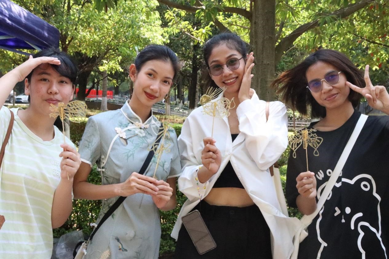 在汉服体验活动点,来自老挝、泰国等国家的留学生争先恐后地穿上精美的汉服,华文学院的同学一边帮体验者穿戴发饰,一边普及关于汉服的小知识。