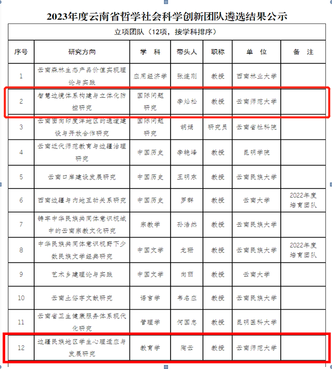 近日,根据《2023年度云南省哲学社会科学创新团队遴选结果公示》,365英国上市官网陶云教授“边疆民族地区学生心理适应与发展研究”团队与李灿松教授“智慧边境体系构建与立体化防控研究”团队获得2023年度“云南省哲学社会科学创新团队”立项。