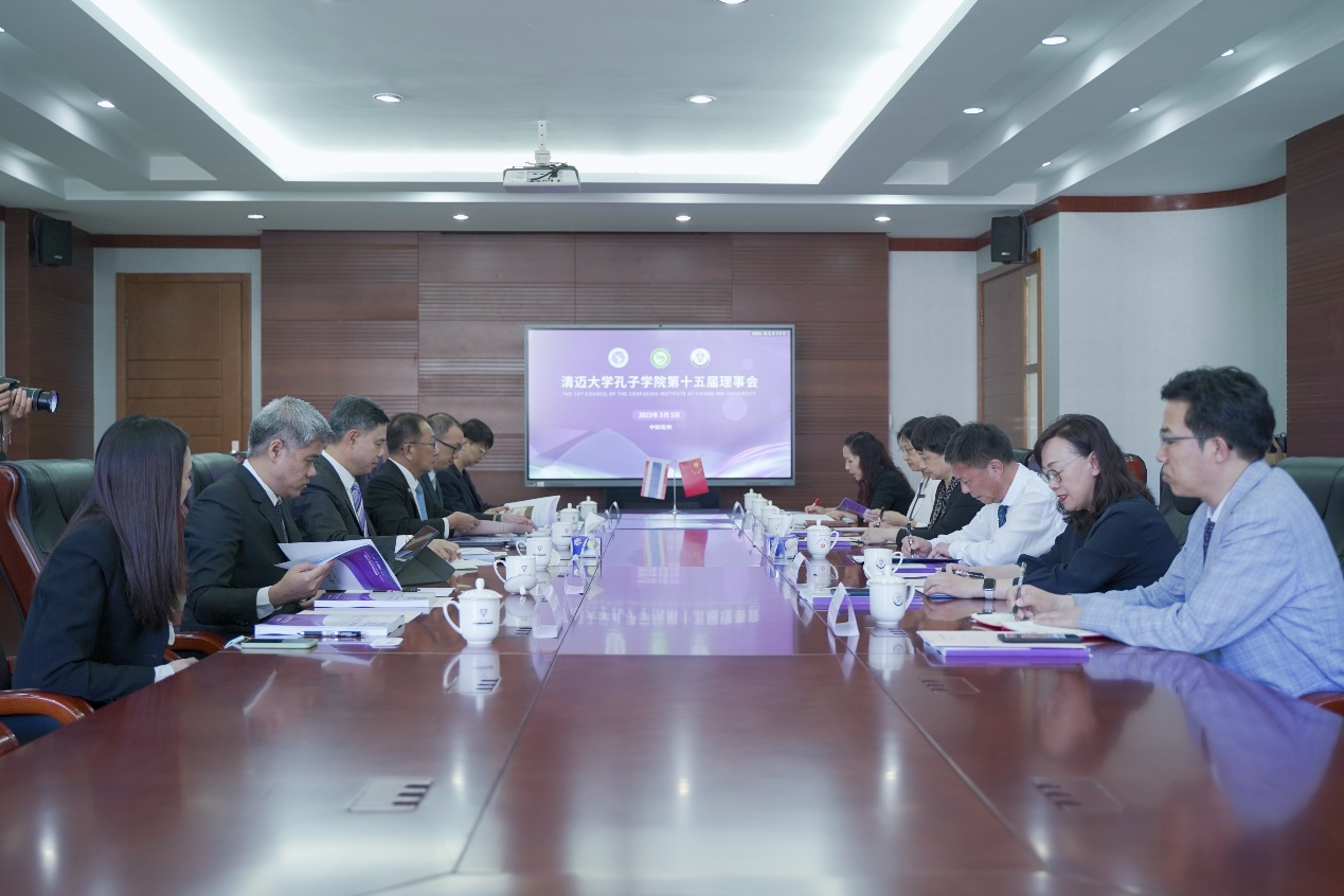 5月5日上午,清迈大学孔子学院第十五届理事会在我校行政楼341会议室召开。校长王德强,副校长郝淑美,华文学院党委书记和雪莲、院长王秀成,对外合作交流处处长黄瑛,清迈大学校长彭拉·习班迪蒙坤,副校长巴瑟·叻格良莱,副校长比迪蓬·佑蒙坤,校长助理沃拉甘亚·卟拉帕塔娜,清迈大学孔子学院中方院长连晨,泰方院长李雄英参加会议。会议由郝淑美主持。