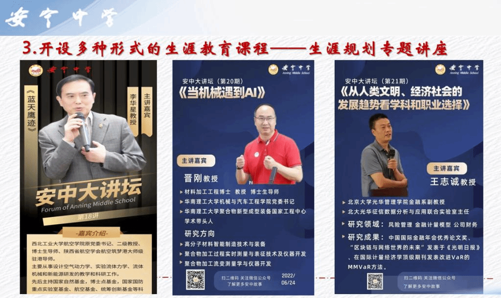 安宁中学学生发展中心主任李绍顼老师作《“1+X”生涯规划实践与思考》主题分享,从“学校教育”“走进高校”“社会实践”“家庭教育”四个板块分享了安宁中学生涯规划教育实践。“1”是以学校为核心,“X”为围绕学生成长成才,聚合高校平台、社会资源、家庭教育等方面的力量,共同牵引和助推学生发展。