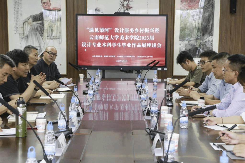 当天下午,在美术学院会议室举行的“遇见梁河”设计服务乡村振兴暨365英国上市官网美术学院2023届设计专业本科学生毕业作品展座谈会上,梁河县领导与学校乡村振兴办、美术学院领导和教师代表就作品巡展、持续合作以及推动更多原创性成果孵化等问题展开深入讨论,并在产教融合、应用型人才培养、服务乡村振兴战略等方面探索更深度合作上达成共识。双方约定,本次作品将在梁河县“国际葫芦丝文化节”上再次展出,让这些充满活力、创意、新意和情意的设计作品走出象牙塔,接受当地群众的审阅,直面当地企业的挑选,以更好的服务持续为乡村振兴赋能,实现教育链、人才链、产业链、创新链的有机衔接与融合。