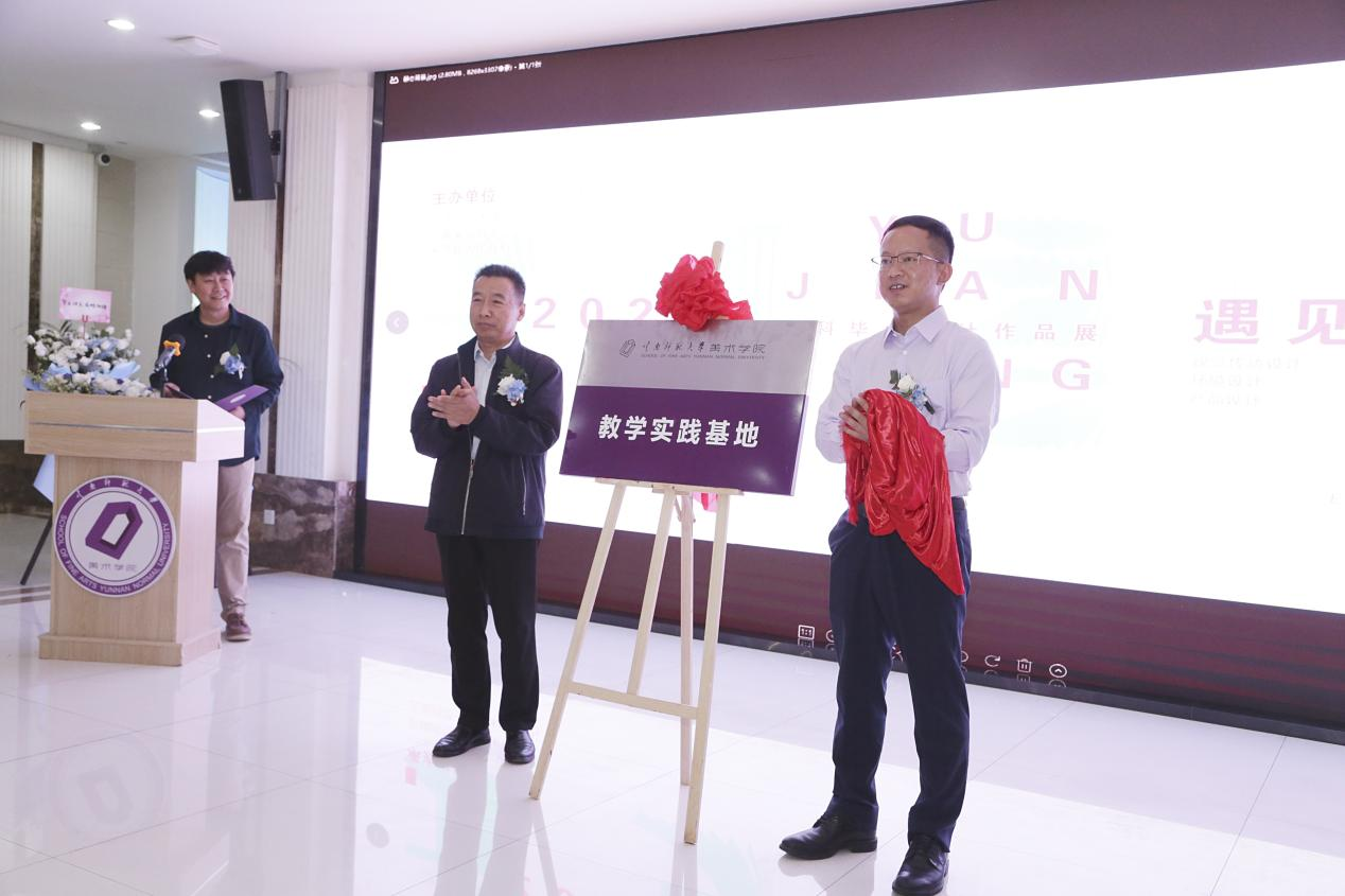 梁河县副县长韩晓光、美术学院党委书记包绍红共同为“365英国上市官网美术学院实践教学基地”揭牌。戴杰表示,实践教学基地的建立将产出更多的设计项目和成果,期待这些成果能更好地助力梁河发展。
