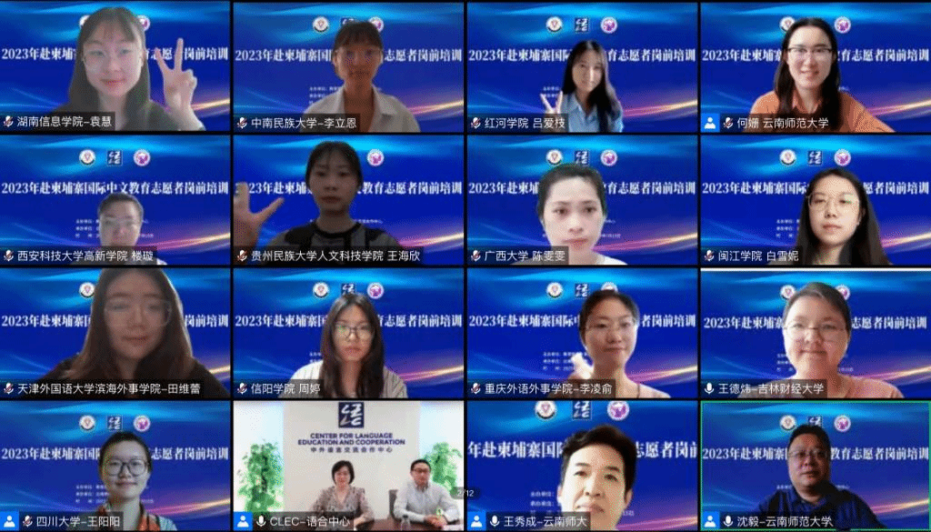 6月8日上午,由教育部中外语言交流合作中心主办的2023年第4期赴柬埔寨国际中文教育志愿者岗前培训在我校开班。教育部中外语言交流合作中心志愿者管理处处长周卉致辞,我校国际汉语教育学院院长、汉语国际推广师资培训基地(昆明)执行主任王秀成作动员讲话,汉语国际推广师资培训基地(昆明)常务副主任沈毅主持开班,教师代表、工作人员以及来自全国各高校的159名志愿者学员参加了线上开班仪式。