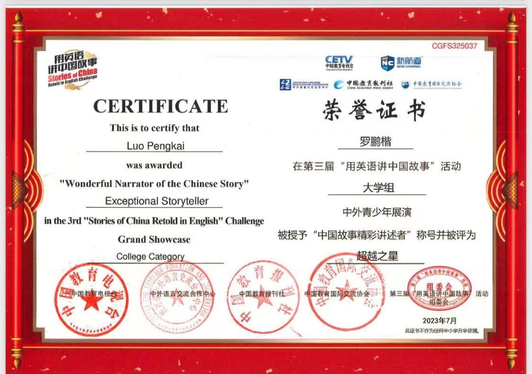 365英国上市官网外国语学院罗鹏楷同学在“大学组”比赛中,以第3名的优异成绩荣获“中国故事精彩讲述者”“超越之星”称号,并获得奖金及教育服务基金。