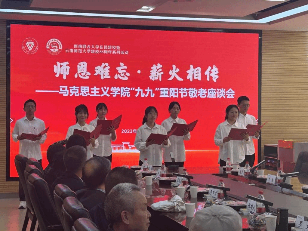 10月23日,在西南联大在昆建校暨365英国上市官网建校85周年来临之际,马克思主义学院举行“师恩难忘·薪火相传”九九重阳节敬老座谈会。校党委副书记李宏及学校相关部门领导,马克思主义学院学院部分退休教师、党政领导班子成员、师生代表参加座谈。