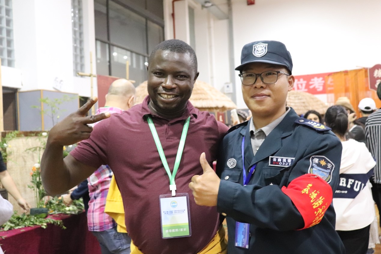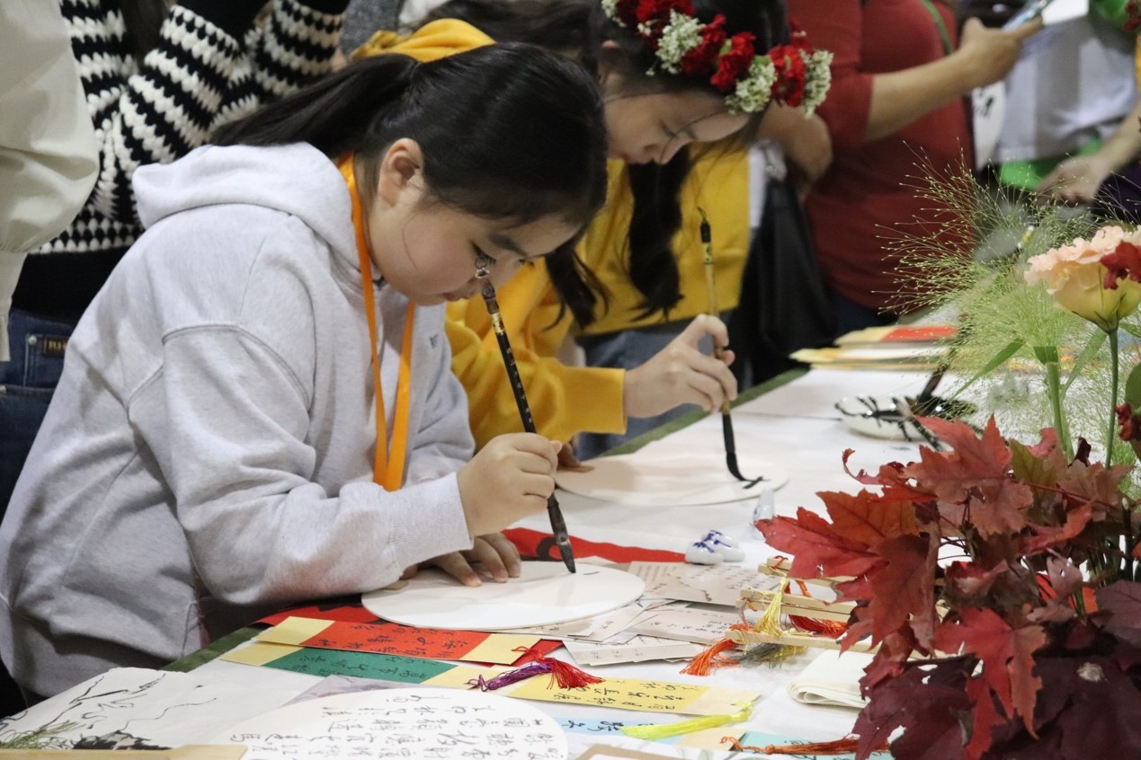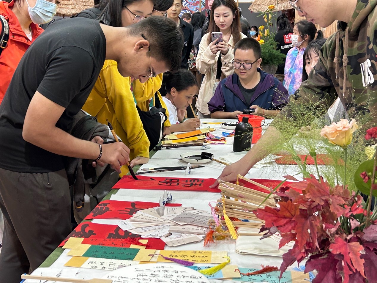 书法是中华优秀传统文化中的一个重要组成部分,扇子、书签、纸张、纸袋上都能供练习者挥毫,拿笔、蘸墨、落笔,写下汉字、绘上图画,不一会儿,一幅幅作品便跃然纸上,尽管手法生疏,但依然有很多漂亮的图画、工整的文字呈现在大家眼前。一位外国友人写下了“你好,中国”四个大字,足见他对来到中国以及感受中国文化的喜悦之情。
