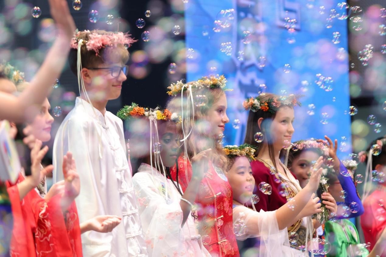 展演现场,来自世界各国的小学生选手们身着传统服饰,为现场观众带来精彩纷呈的表演。他们或打响节奏轻巧的快板,或抖动脆如银筝的空竹,或跳起霓裳翩翩的舞蹈……一静一动,皆展魅力风采,一吟一唱,尽扬优美韵律。