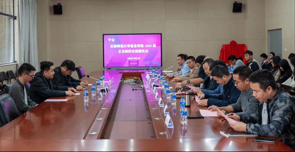 2003级校友代表、昆明麦岚企业管理有限公司董事长王玉峰及副总经理张寅;我校副校长甘健侯,校友工作办公室副主任、教育基金会理事长谢锋,信息学院领导班子成员、师生代表参加捐赠仪式。
