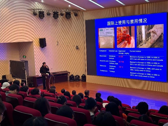 讲座中,程和发教授从禽畜养殖与饲料添加剂污染、苯胂酸饲料添加剂的环境归宿、苯胂酸饲料添加剂污染控制、苯胂酸饲料添加剂导致的健康风险等方面,介绍了苯胂酸作为饲料添加剂对环境和人体产生危害。报告从污染物的环境行为、控制方法、人群健康到政策制定,涉及多学科知识,囊括了程和发教授近十年的研究成果,为在场师生呈献了一场精彩的高水平学术讲座。