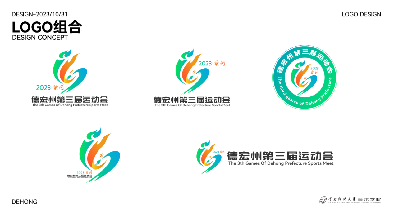 本届运动会会徽和吉祥物由我校美术学院谭玉琳老师和陶轩宇、肖杨、盛钰涵同学共同设计完成。会徽巧妙融合了葫芦丝、孔雀羽毛、火焰和跑道等元素,充分展示了德宏特色民族文化内涵,代表着热情、活力、拼搏的运动精神。