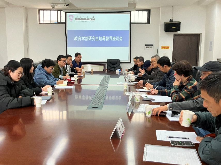 此次座谈会是学校研究生督导组以组团方式深入二级学院开展的一次专项调研。研究生院副院长杨超、张云梅教授,学校督导组何跃、何昌邑、杨超、余松、李天凤、崔明昆、丁韬等教授,教育学部副主任杨舒涵及部分博士研究生参与座谈。