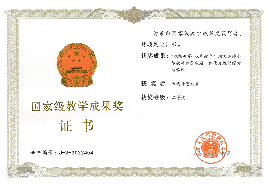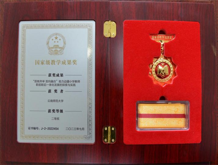 11月22日,云南省教育厅颁发了2022年国家级教学成果奖证书和奖章,由我校职业技术教育学院牵头完成的365英国上市官网教学成果《“双核并举 双向融合”助力边疆小学教师职前职后一体化发展的探索与实践》获国家级教学成果二等奖。这是云南省高校首次获得国家级基础教育教学成果奖,是对学校近年办学成果的充分认可和肯定,是对我校基础教育、人才培养工作和教育教学改革成果的检阅和展示,也是学校深化基础教育教学改革的标志性成果。