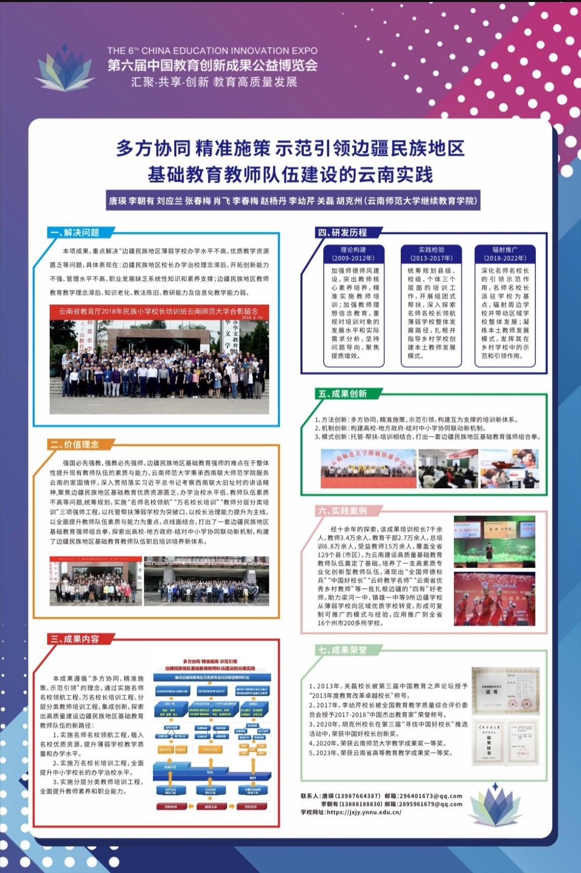 11月18至21日,我校继续教育学院团队赴珠海参加第六届中国教育创新成果公益博览会(以下简称“教博会”)。继续教育学院成果“多方协同 精准施策 示范引领边疆民族地区基础教育教师队伍建设的云南实践”经教博会层层审查,入选第六届中国教育创新成果公益博览会展览展示。