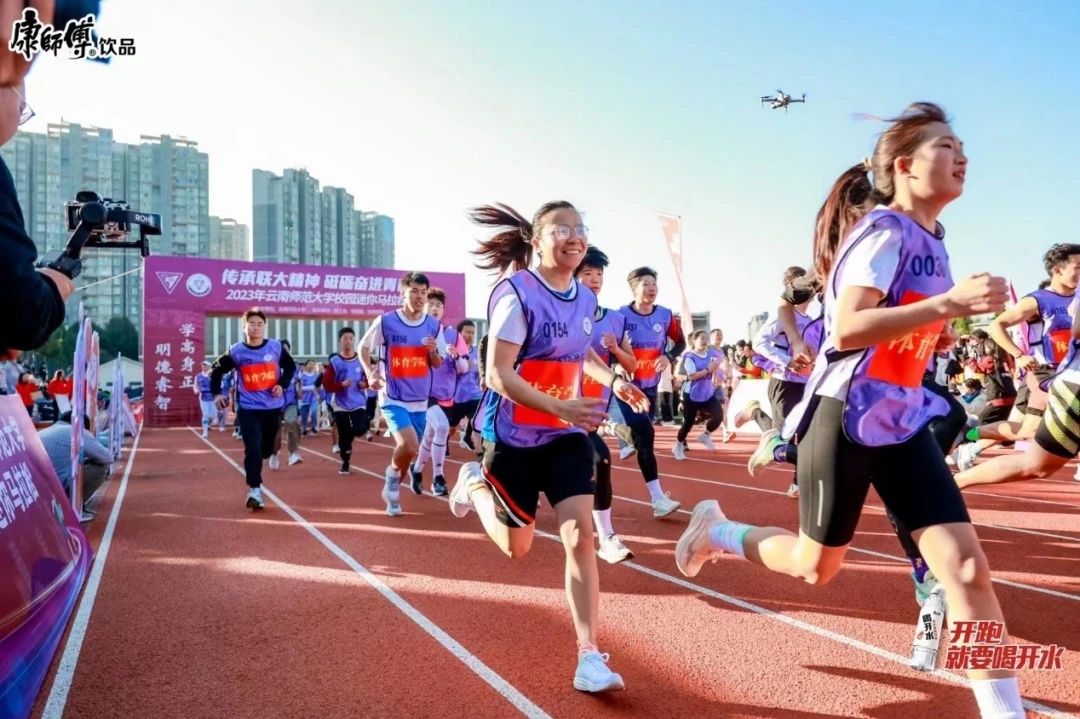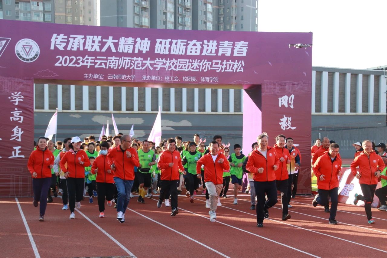 赛前,体育学院运动员江南及张敏娟带领全体参赛选手进行集体热身。奏唱国歌后,校党委副书记李宏、张玮,副校长孟庆红、牛治亮、武友德,纪委书记、监察专员孙剑等多位老师鸣响汽笛枪,数千名云师人激情开跑。
