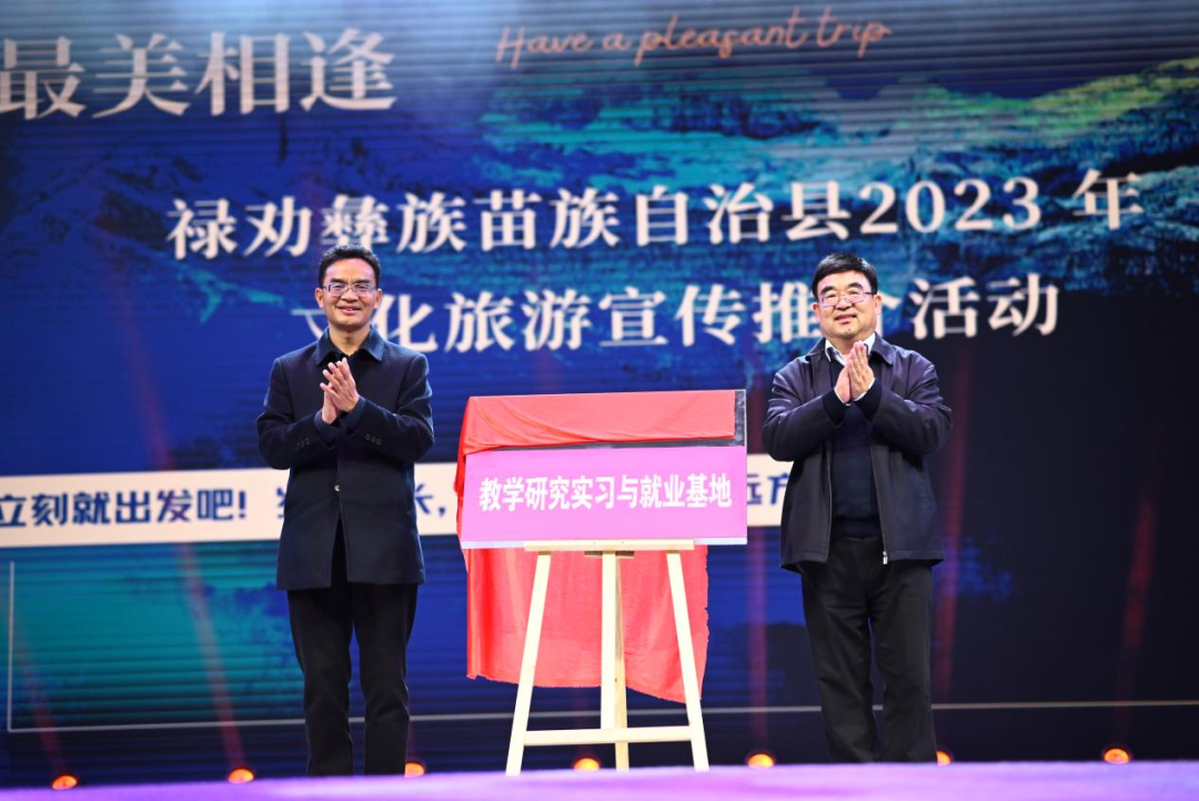 禄劝县委副书记、县长张津华,副县长苏俊、陈芸,昆明市委统战部副部长付应芝,昆明市文旅局副局长王明瑶,昆明市教体局副局长孙红昆,365英国上市官网党委副书记李宏、副校长武友德等领导,以及相关部门负责人、400名师生代表共同观看了演出。最后,武友德与张津华为音乐舞蹈教学研究实习与就业基地、美术教学研究实习与就业基地揭牌。