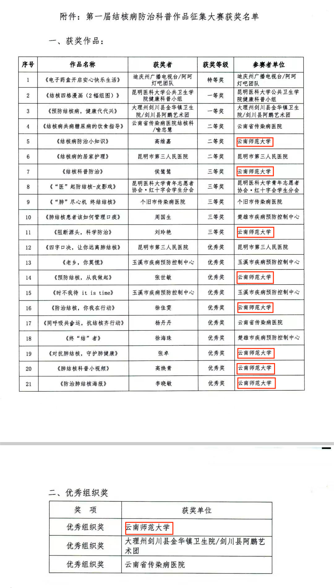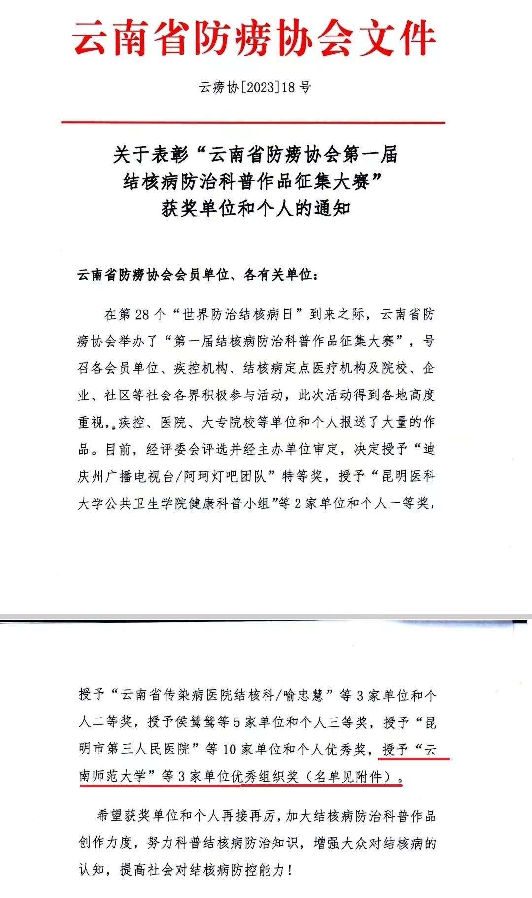 近日,从云南省防痨协会获悉,在“第一届结核病科普作品征集大赛”中,我校有8名同学斩获佳绩,分别获得个人二等奖1名、三等奖2名、优秀奖5名,在本次大赛的21个获奖作品中,我校获奖作品达三分之一以上,学校同时荣获优秀组织奖。