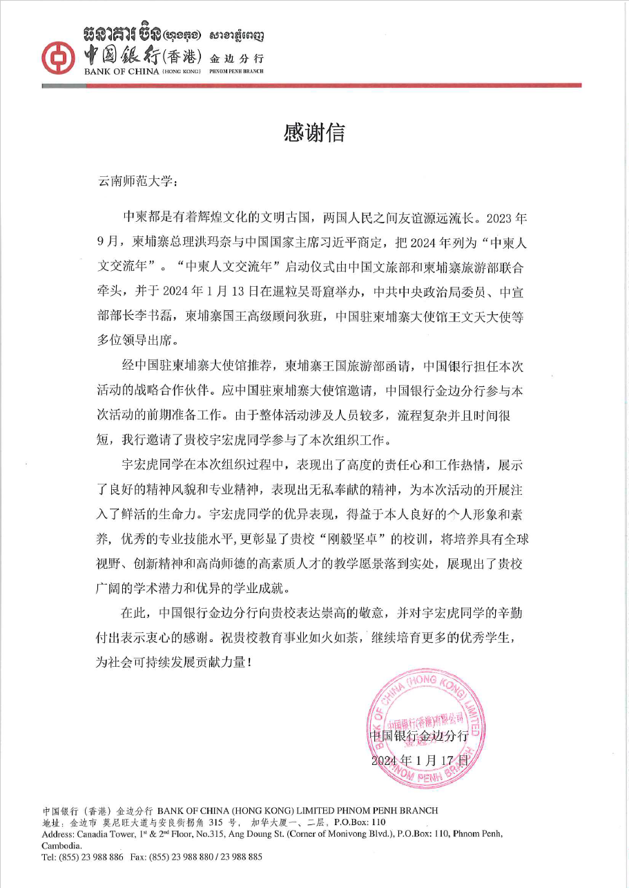 2024年是中柬人文交流年,为进一步促进文化交流和民心相通,展示两国间深厚的友谊与合作,1月13日晚, “中柬人文交流年”启动仪式在柬埔寨暹粒举行。我校华文学院9名在柬埔寨金边皇家大学留学的本科生有幸受邀参与启动仪式,其中宇宏虎同学应本次活动战略合作伙伴——中国银行金边分行邀请,积极配合相关机构完成了活动的组织工作,并获中国银行金边分行的感谢信。