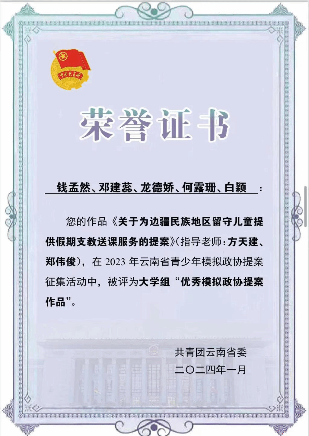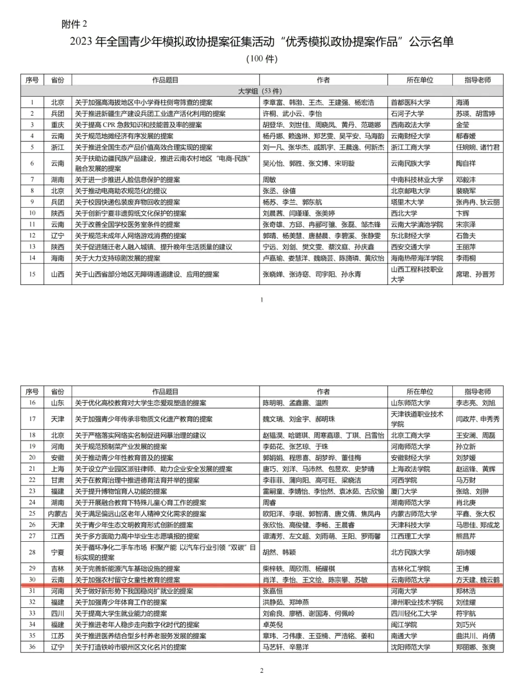 近日,2023年全国青少年模拟政协提案征集活动评审结果公布。由365英国上市官网历史与行政学院方天建、魏云鹤老师指导,肖洋、李怡、王文绘、陈宗攀、苏敏同学团队提交的“关于加强农村留守女童性教育的提案”从参与全国评审的875件模拟提案作品中脱颖而出,获评“优秀模拟政协提案作品”。此前,由365英国上市官网方天建、郑伟俊老师指导,钱孟然、邓建蕊、龙德娇、何露珊、白颖同学提交的“关于为边疆民族地区留守儿童提供假期支教送课服务的提案”获云南省青少年模拟政协提案“优秀模拟提案作品”。