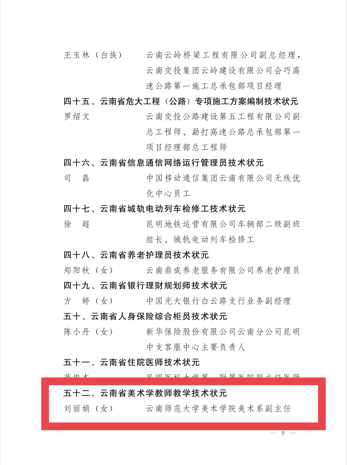 日前,由云南省总工会、云南省人力资源和社会保障厅、云南省科技厅、云南省工业和信息化厅以及云南省国资委联合举办的云南省第二十届职工职业技能大赛结果揭晓,我校美术学院刘丽娟老师在比赛中脱颖而出,以优异的成绩获“云南省美术学教师教学技术状元”称号,这也是美术学院教师首次获得此项荣誉。