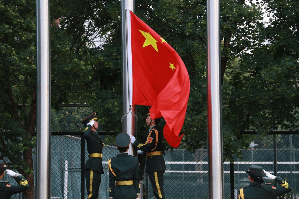 第一项议程为升国旗仪式。国旗护卫队、国旗督察队护送国旗入场并升国旗,全体人员肃立,行注目礼,齐声奏唱国歌。