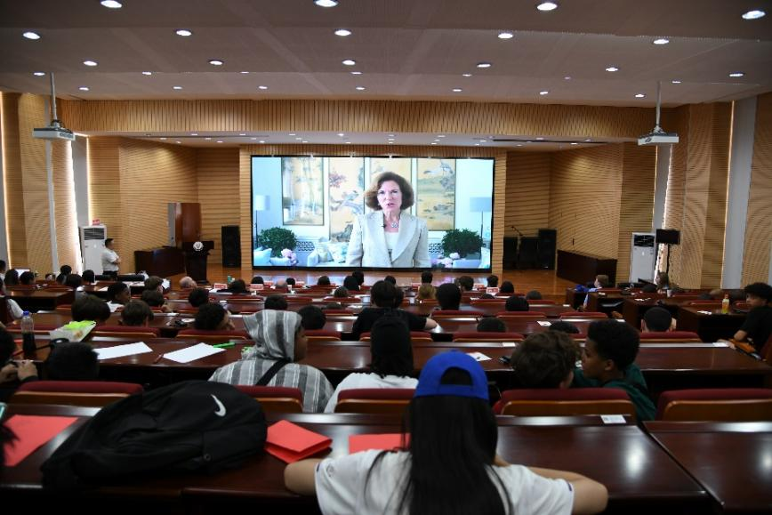 结营仪式上,英国驻华大使吴若兰女士视频致辞,感谢语合中心、伦敦大学学院教育学院和英国文化教育协会对本次夏令营的支持,感谢中国承办院校的辛勤付出,全面组织、有序带领英国同学沉浸式学习中文,感受中国文化。她表示未来非常需要大批能够致力于中英密切合作、友好发展的人才。吴若兰引用“书山有路勤为径,学海无涯苦作舟”,鼓励英国同学继续好好学习中文,今后成为中英友好使者。