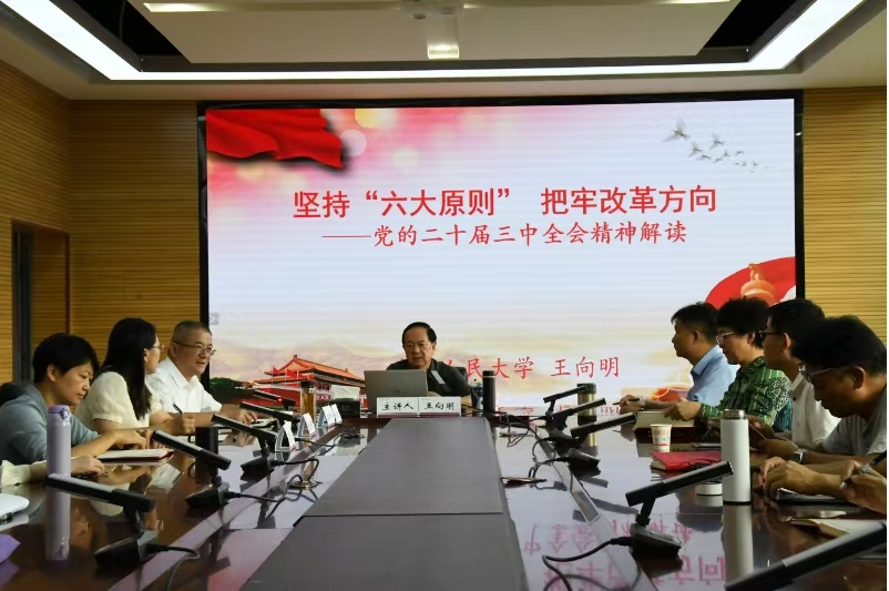 王向明以《坚持“六大原则”,把牢改革方向》为题,重点从党的二十届三中全会的价值所在阐释了全会基本精神。王向明讲述了全会召开的背景及重大意义,并从“坚持党的全面领导、坚持以人民为中心、坚持守正创新、坚持以制度建设为主线、坚持全面依法治国、坚持系统观念”六个方面,解读了进一步全面深化改革必须贯彻的重大原则。王向明强调,只有贯彻好“六个坚持”原则,才能把牢改革方向,不断为中国式现代化注入强劲动力和提供有力保障。