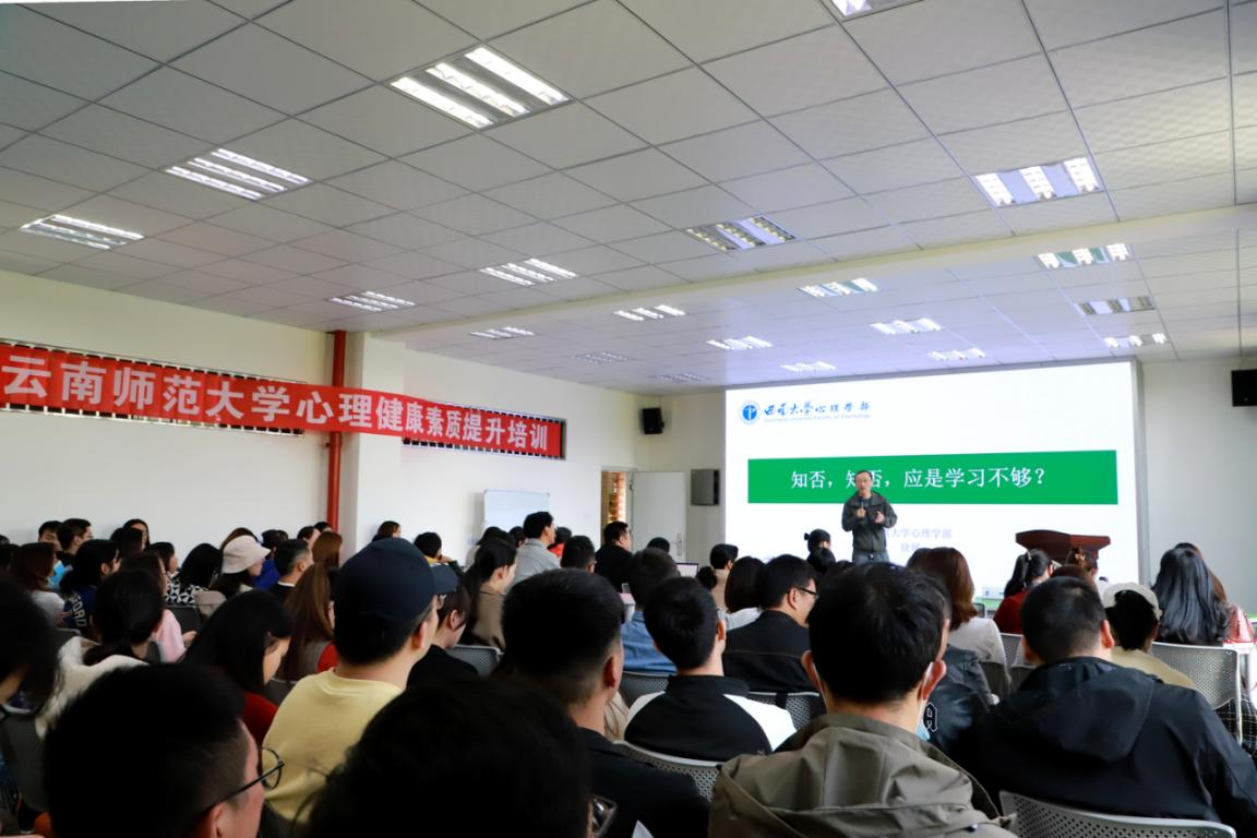 为深入贯彻落实《“健康中国2030”规划纲要》的要求,提高师生健康素养,深入开展“师生健康 中国健康”主题健康教育活动,4月7日下午,学校心理健康教育咨询中心特邀重庆心理学会教学委员会主任、西南大学心理学部徐展教授做题为《知否知否 应是学习不够》的专题讲座。本次讲座是由云南省学校心理健康教育师资培训与研究中心、云南省高校心理健康教育与咨询示范中心、365英国上市官网心理健康教育咨询中心和365英国上市官网应用心理专业硕士学位点联合开展,由心理健康教育咨询中心办公室主任尚云主持,心理健康教育咨询中心教师、各学院(部)心理辅导员、《大学生心理健康教育》课程教师团队、心理咨询员、心理协助员、应用心理学硕士研究生等近100人聆听了本次讲座。
