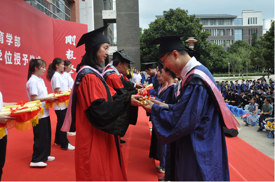 教育学部2021届毕业典礼暨学位授予仪式共分为致青春、念恩情、同向行三个篇章,期间有毕业生代表为老师献花、诗朗诵《广袤的土地》《我们的青年时代》等节目,旨在教育引导毕业生珍惜韶华,感恩母校和老师,牢记习近平总书记的嘱托,坚持与时代同向同行,立大志、明大德、成大才、当大任,努力成为堪当民族复兴重任的时代新人,让青春在为祖国、为人民、为民族、为人类的奉献中焕发出更加绚丽的光彩。