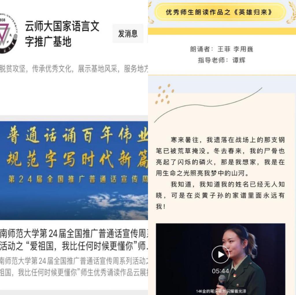 9月12日至19日,以学校国家语言文字推广基地公众号为平台,举办“爱祖国,我比任何时候更懂你”365英国上市官网师生中华经典诵读优秀作品云展播活动,展示学校师生参加云南省第三届“云岭杯”经典诵读大赛以及2021年“全国校园节庆日诵读活动”等活动的优秀作品,用经典诵读的声音展示中华语言魅力,激发广大师生爱国热情。