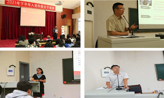 历史与行政学院党委书记余明九老师围绕党章向大家介绍了党的性质、宗旨、指导思想和纲领,让同学们知道中国共产党是怎么样的组织,学习党章后在行为上践行党章。生命科学学院党委委员、院长范丽仙老师围绕党的组织原则及对于党的纪律的内涵理解,最后强调了党员要自觉遵守党的组织原则,严格恪守党的纪律。同时指出,作为一名入党积极分子,不仅要不断加强理论的学习,还要践行到学习、生活中。历史与行政学院党委副书记徐振坤老师带领大家学习了习近平新时代中国特色社会主义思想,希望各位同学在理论上入党,思想上入党,行动上入党,成为一名合格的党员。生命科学学院党委委员高艳秀老师围绕学习贯彻习近平总书记在庆祝中国共产党成立100周年大会上的重要讲话精神开展专题辅导。