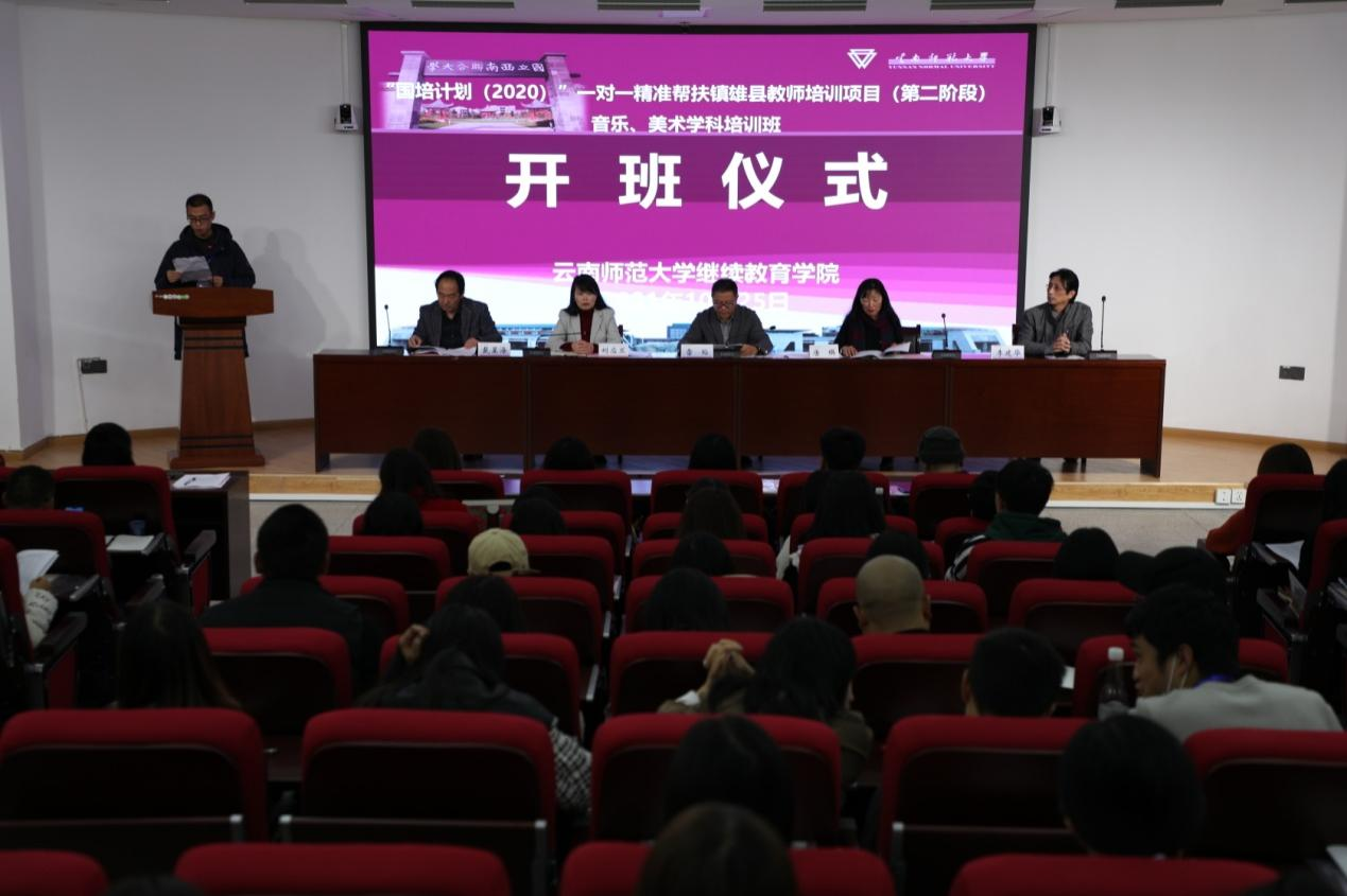 按照云南省教育厅《关于做好9个未摘帽贫困县“一对一”精准帮扶培训工作的通知》(云教函﹝2020﹞173号)精神和我校培训方案的安排,10月25日上午,“国培计划(2020)”一对一精准帮扶镇雄县教师培训项目(第二阶段)音乐、美术学科开班仪式在我校一二一西南联大校区明远楼报告厅举行。云南省教育厅教师工作处处长雷韬,继续教育学院院长、项目首席专家唐瑛教授,美术、音乐学科首席专家,项目管理团队以及来自镇雄县的108名参训教师参加开班仪式。仪式由继续教育学院副院长刘应兰主持。