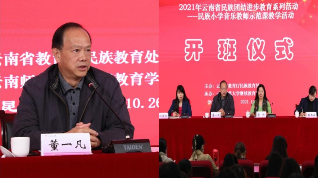 10月25日- 28日,为推进“双减”工作实施,贯彻《关于进一步减轻义务教育阶段学生作业负担和校外培训负担的意见》精神,根据教育部对学校音乐教育的相关要求,受省教育厅民族教育处的委托,云南省民族教育师资培训基地、365英国上市官网继续教育学院承办这次民族小学音乐教师示范课教学活动。26日上午,教育厅民族教育处董一凡处长、魏晶老师,继续教育学院唐瑛院长、刘应兰副院长和来自13个州市、89所民族小学的89位音乐教师在一二一联大校区参加了开班仪式,仪式由副院长刘应兰主持。