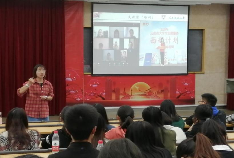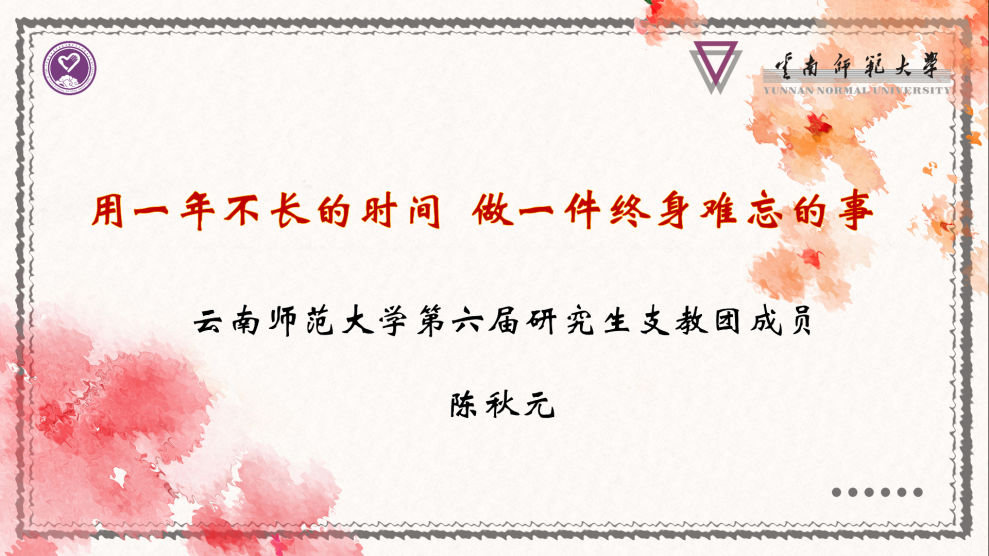 陈秋元从支教前的准备、支教中的工作和感触三部分进行了分享。她介绍了中国青年志愿者扶贫接力计划研究生支教团基本情况,讲述了自己支教前笔试、面试的准备工作以及到云南昭通鲁甸县龙泉中学支教的原因,希望同学们一定要将“奉献、友爱、互助、进步”的志愿服务精神牢记在心。