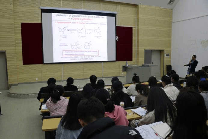 氮杂环化合物广泛存在于药物、生物活性分子和天然产物之中。炔酰胺是一类酰胺基与炔基直接相连的化合物,具有如下特性:易合成,稳定,部分商业可得;可一步合成氮杂环分子;可从炔酰胺的多个位点定点引入官能团。但是,有关炔酰胺的研究仍面临诸多困境:不对称催化极具挑战;反应模式单一,主要局限于贵金属催化;相关的杂环结构多样性合成非常受限。本次讲座内容主要围绕通过设计双官能团炔酰胺底物,建立了基于炔酰胺的手性金属催化、手性有机酸催化、手性有机碱催化和可见光催化等催化新模式,为系列重要手性氮杂环的结构多样性合成提供了新方法、新策略和新途径。同时,叶龙武教授也介绍了厦门大学及其课题组研究生的相关工作、学习及生活情况,邀请并鼓励化学化工学院学生积极报考厦门大学博士及硕士研究生。