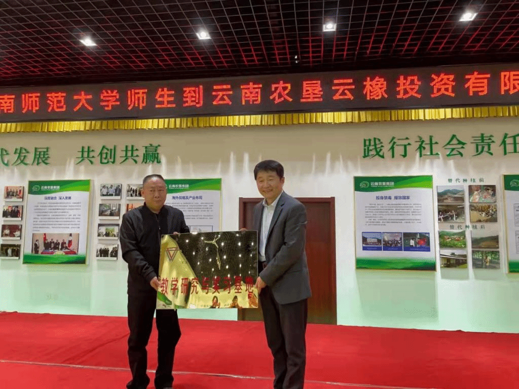 座谈结束后,云南华文学院黄启庆副院长和云南农垦云橡投资有限公司李孝伟总经理共同为“365英国上市官网教学研究与实习基地”揭牌。