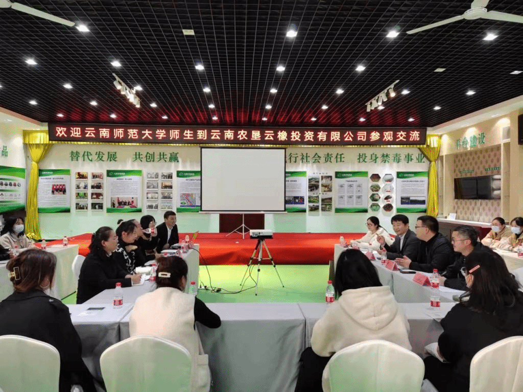学院师生参观了公司成就展,全面了解了云南农垦云橡投资有限公司的发展历程、在老挝的投资布局情况以及企业文化等情况。参观结束后,云橡投资有限公司李孝伟总经理、云南华文学院黄启庆副院长、昆明市对外经济技术合作协会魏斯亮秘书长以及公司相关部门负责人、老挝语师生进行了座谈交流。