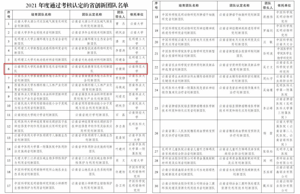 近日,省科技厅根据《云南省创新团队管理办法》规定,组织专家对培育期满的30个云南省创新团队培育对象进行考核认定。我校甘健侯教授为带头人的云南省民族教育信息化创新团队,经团队申请、单位审核、专家评审、科技厅审定等程序,顺利通过此次认定考核,并被正式授予云南省创新团队称号。
