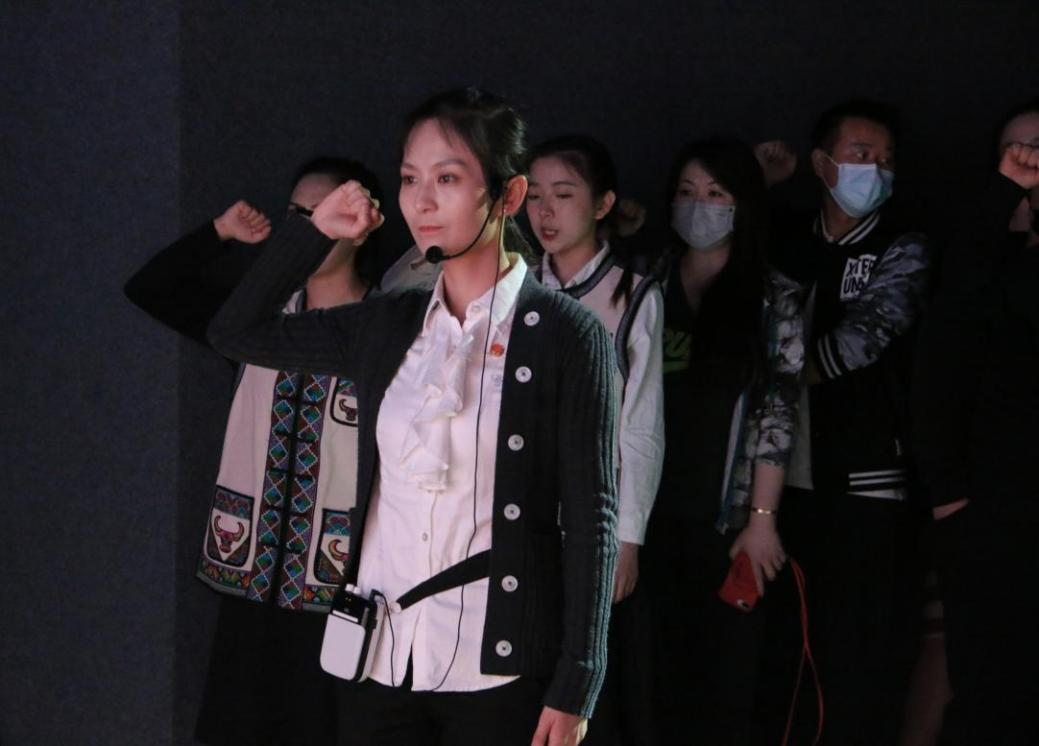 在沉浸式互动体验剧分展部分,演员倾情演出,情景环环相扣,参观人员仿佛回到了百年前五四运动的现场,反军阀、惩国贼的青年救亡运动在眼前呈现……时间线拉回到现在,新时代脱贫攻坚、抗击疫情、科技发展的画面牵动着观众的心,百年历程、百年奋进、百年辉煌,一代代青年先后以青春之我创建青春之国家、青春之民族,为实现中华民族伟大复兴而奋斗不息。最后一个环节,讲解员带领现场观众一起重温了入团誓词,铿锵誓言久久回荡、振奋人心。
