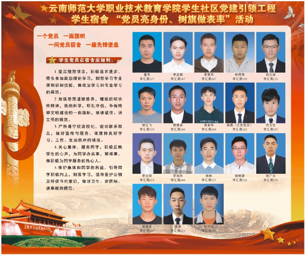 为深入推进思想政治工作进学生社区,加强党建引领,充分发挥党员先锋模范作用,全面提升思政育人实效,5月13日,职业技术教育学院在一二·一西南联大校区组织开展“党员亮身份 树旗做表率”学生党员宿舍挂牌活动。学院党委书记刘虹,副书记向斯楠,支部书记、辅导员及党员宿舍代表参加了活动。