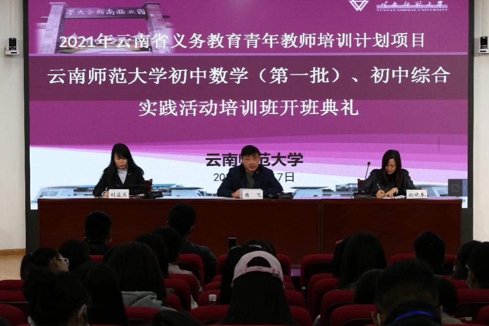 5月17日上午,由继续教育学院承办的2021年云南省义务教育青年教师培训计划初中数学(第一批)、初中综合实践活动培训班,在我校一二·一西南联大校区明达楼举行开班仪式。为积极落实疫情常态化防控工作部署,开班仪式采取线上线下同步进行的方式,主会场设在明达楼一楼报告厅,分会场设在明达楼302、402教室。继续教育学院党委书记肖飞,副院长刘应兰,初中综合实践活动学科首席专家孙晓春副教授,项目管理团队以及来自全省16个州市的200名参训教师参加开班仪式。仪式由继续教育学院刘应兰副院长主持。
