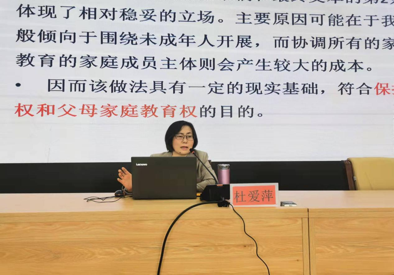 5月9日至15日,是全国首个“家庭教育宣传周”。我校杜爱萍副教授应邀参加了云南省妇联与云南省教育厅举办的“送法进万家 家教伴成长”为主题的系列活动。5月9日与5月12日,杜爱萍副教授以“家事入国法 教育促和谐”为主题,为来自31个省级单位的干部以及玉溪市红塔区妇儿工委成员单位工作人员解读了《家庭教育促进法》的出台背景及意义、法律依据、具体内容以及适用中须注意的问题等。参加培训成员均表示对《家庭教育促进法》有了更深刻的认识。