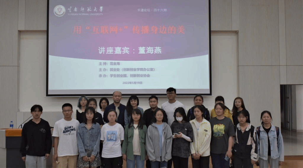 5月19日下午,求道论坛第四十六期于我校呈贡主校区同析楼二栋110报告厅如期举行,来自各学院(部)的200多名同学积极参加本次讲座。本次讲座邀请到云南泰锐文化传播有限公司董事长、高级电子商务师董海燕作为主讲嘉宾。董海燕老师多年从事文旅产业工作,在指导高校学生创业方面有着丰富经验,讲座主题为“用‘互联网+’传播身边的美”。