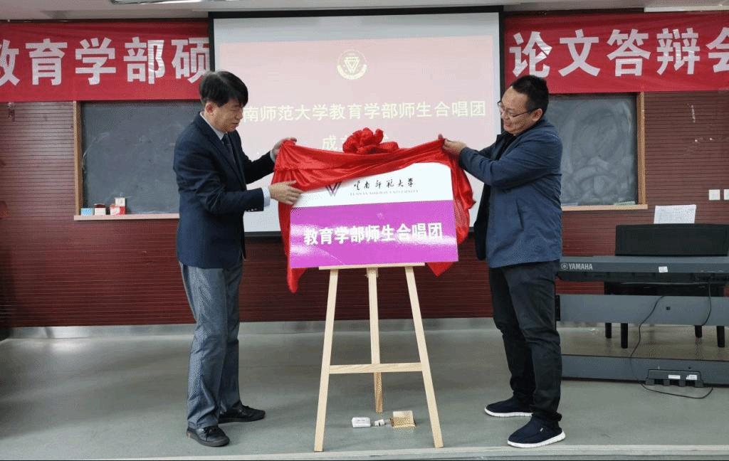 禹紫灵书记与王文军副主任共同为教育学部师生合唱团揭牌。随后,学院领导共同为艺术指导组教师代表颁发聘书,向团员代表、声部长颁发团员证与合唱谱。