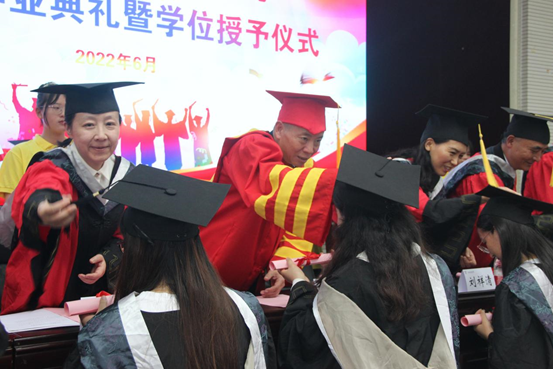 随着庄严的国歌响彻活动会场,毕业典礼拉开帷幕。李芳副院长宣读2022届毕业生及获得学位情况、2022届研究生毕业及获得学位情况。王源昌书记宣读了2022届省级优秀毕业生和校级优秀毕业生表彰名单。主席台领导依次为省级、校级优秀毕业生颁发荣誉证书。随后,老师们为2022届毕业生拨穗正冠,进行学位授予。这是学校学院对每一位毕业生的肯定和祝愿,寄托着老师们对毕业生们的殷切期望。